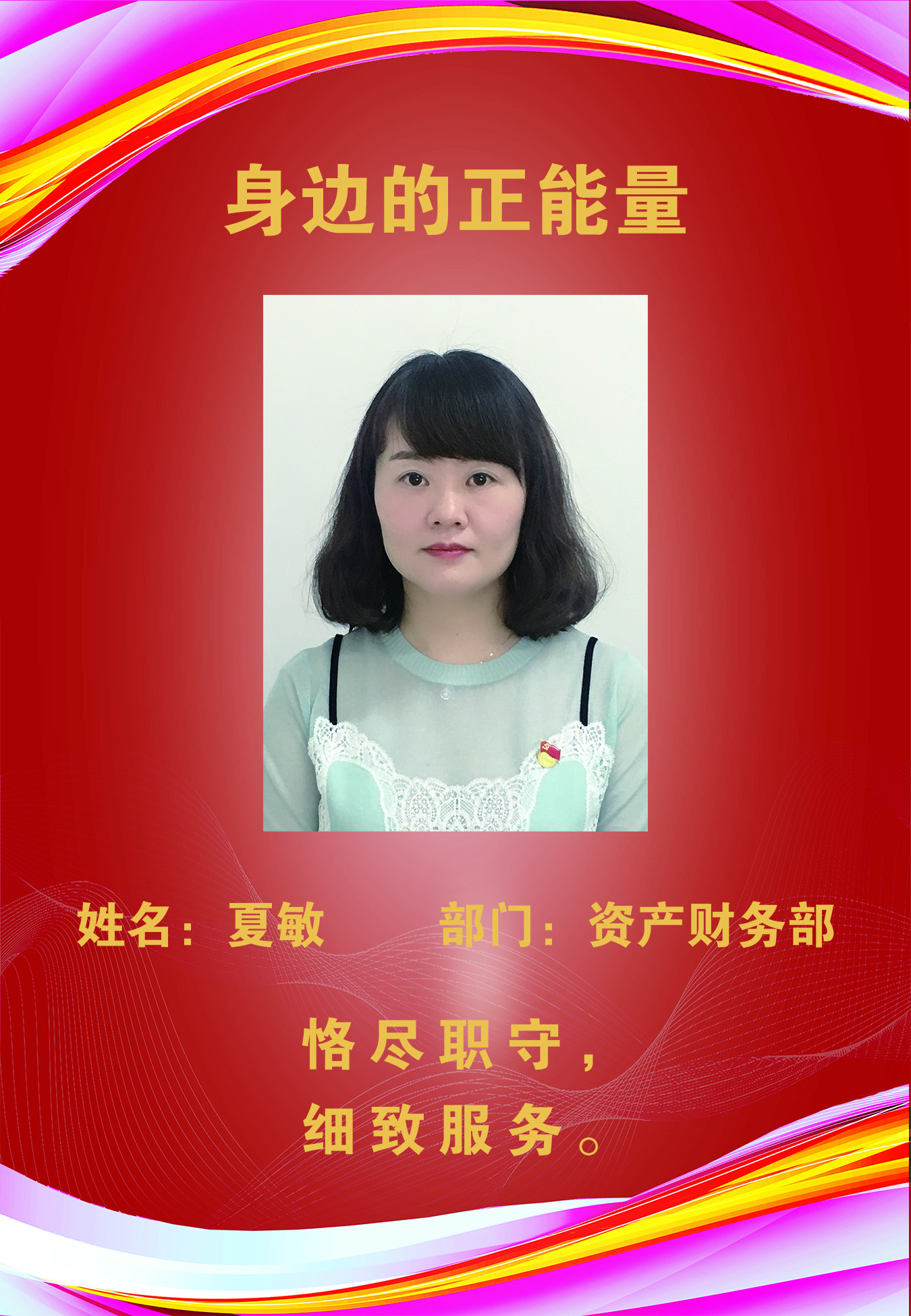 夏敏,女,1979年生,大學(xué)本科學(xué)歷,現(xiàn)資產(chǎn)財(cái)務(wù)部任職。