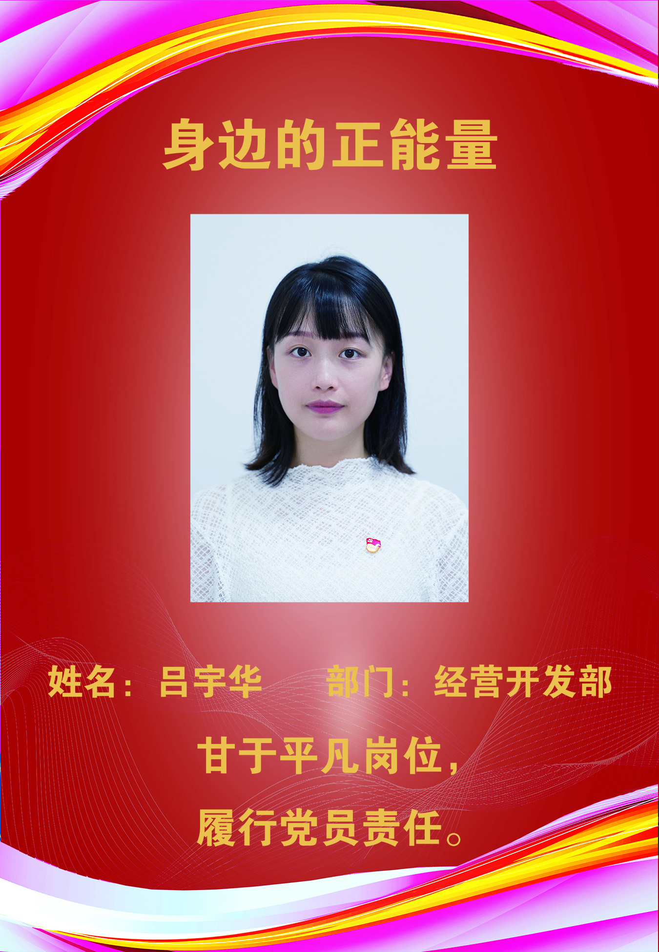 呂宇華,女,1992年出生,大學(xué)本科學(xué)歷,現(xiàn)經(jīng)營(yíng)開發(fā)部任職。