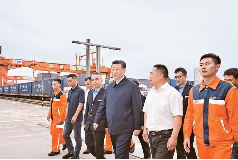 2024年4月22日至24日,中共中央總書記、國家主席、中央軍委主席習近平在重慶考察。這是22日下午,習近平在重慶國際物流樞紐園區(qū)重慶鐵路集裝箱中心站,同貨車司機、列車司機、裝卸工人、場站管理人員等親切交流。 新華社記者 岳月偉/攝