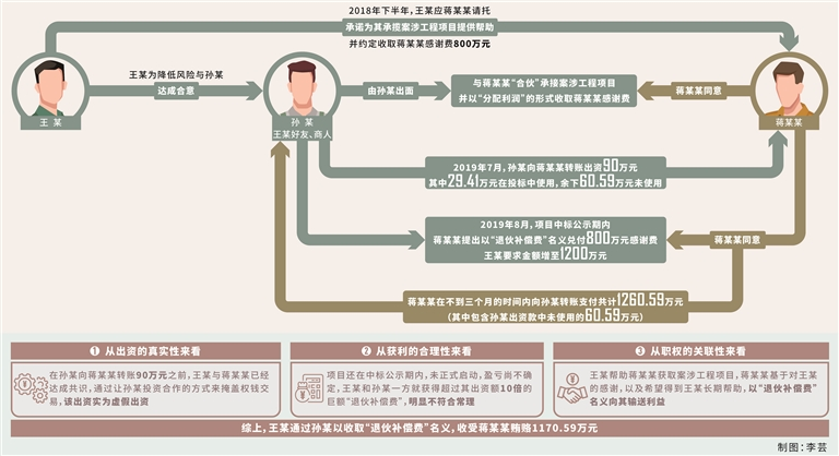 萬(wàn)玉博:在案件查辦過(guò)程中,審查調(diào)查人員發(fā)現(xiàn),王某為了掩蓋其與蔣某某的權(quán)錢(qián)交易,采取讓其朋友、商人孫某與蔣某某合伙承接案涉工程項(xiàng)目的方式,企圖將感謝費(fèi)披上民事行為的合法外衣。經(jīng)梳理,王某收受蔣某某感謝費(fèi)主要實(shí)施了以下步驟: