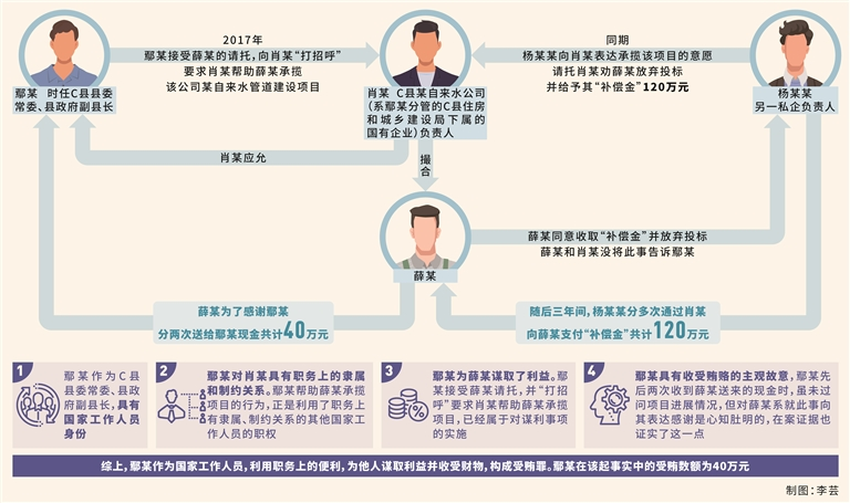 其中,2017年,鄢某在擔(dān)任C縣縣委常委、縣政府副縣長(zhǎng)期間,接受商人薛某的請(qǐng)托,向C縣某自來(lái)水公司(系鄢某分管的C縣住房和城鄉(xiāng)建設(shè)局下屬的國(guó)有企業(yè))負(fù)責(zé)人肖某“打招呼”,要求肖某幫助薛某承攬?jiān)摴灸匙詠?lái)水管道建設(shè)項(xiàng)目,肖某應(yīng)允。同期,另一私企負(fù)責(zé)人楊某某向肖某表達(dá)承攬?jiān)擁?xiàng)目的意愿,請(qǐng)托肖某勸薛某放棄投標(biāo)并給予其“補(bǔ)償金”120萬(wàn)元。經(jīng)肖某撮合,薛某同意收取“補(bǔ)償金”并放棄投標(biāo)。薛某和肖某沒(méi)將此事告訴鄢某。最終,在肖某的幫助下,楊某某公司順利中標(biāo)該項(xiàng)目。隨后三年間,楊某某分多次通過(guò)肖某向薛某支付“補(bǔ)償金”共計(jì)120萬(wàn)元。薛某為了感謝鄢某,分兩次送給鄢某現(xiàn)金共計(jì)40萬(wàn)元。