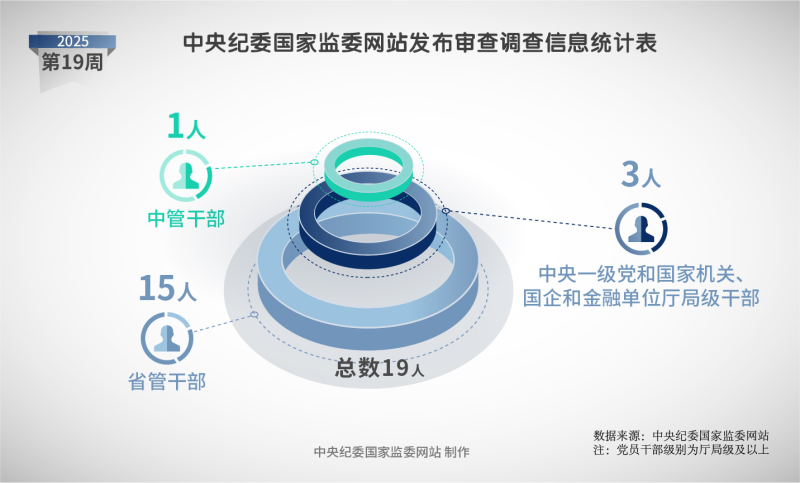 2025年第19周,中央紀委國家監(jiān)委網(wǎng)站共發(fā)布19條審查調(diào)查信息。其中,中管干部1人,中央一級黨和國家機關(guān)、國企和金融單位廳局級干部3人,省管干部15人。