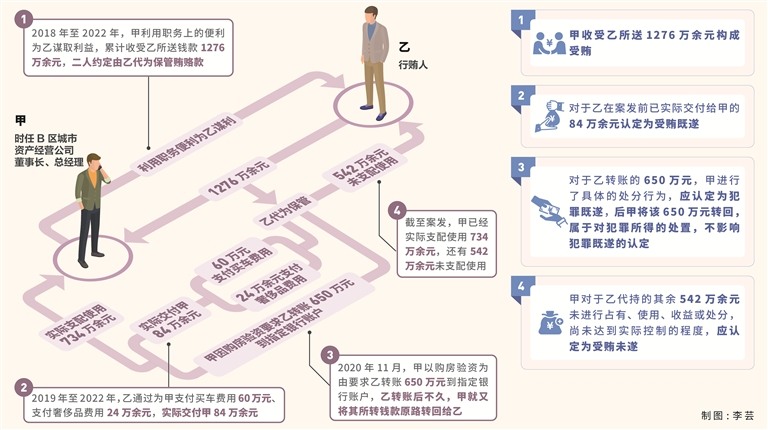 在行賄人代持賄賂款物案件中,受賄人主觀上已具有權錢交易的故意,但由于形式上賄賂款物未交付,故要全面結合證據(jù)分析受賄人是否已對財物實現(xiàn)控制,以確保主客觀相一致。本案中,甲利用其作為國有企業(yè)董事長、總經(jīng)理職務上的便利為乙謀取巨額利益,收受乙所送款項1276萬余元,并約定該款項由乙代為保管。至案發(fā)時,乙通過為甲支付買車費用60萬元、支付奢侈品費用24萬余元,已實際交付甲84萬余元,此84萬余元當然為受賄既遂。此外,甲因自身買房驗資需要,數(shù)次安排乙從代其保管的款項中予以提取,2020年11月23日至26日,乙接受甲安排轉賬650萬元到其指定賬戶,此時,甲已具有對該650萬元完全的管理權和支配權,該650萬元應當認定為犯罪既遂,甲雖于2020年11月30日至2020年12月3日陸續(xù)將該650萬元轉回匯款賬戶,但這屬于甲對其犯罪所得的自行處置,并不影響其受賄犯罪既遂的認定。此外,甲還以同樣方式,分別讓乙轉賬300萬元、200萬元,考慮到這兩次甲調用金額均未超過此前轉回的650萬元,因此,對其受賄既遂數(shù)額不作累計計算。綜上,對甲已經(jīng)實際支配使用的734萬余元應認定為犯罪既遂。