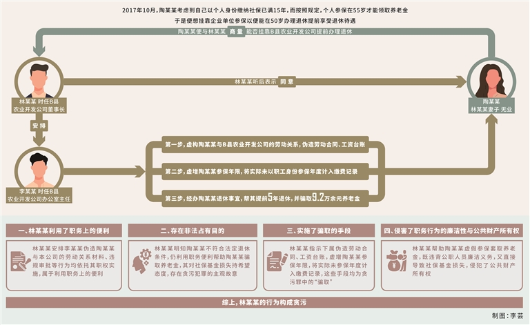 貪污罪。2017年10月,林某某妻子陶某某(無(wú)業(yè),另案處理)考慮到自己以個(gè)人身份繳納社保已滿15年,而按照規(guī)定,個(gè)人參保在55歲才能領(lǐng)取養(yǎng)老金,于是便想掛靠企業(yè)單位參保,以便能在50歲辦理退休、提前享受退休待遇;诖,陶某某便與林某某商量能否掛靠B縣農(nóng)業(yè)開(kāi)發(fā)公司提前辦理退休,林某某聽(tīng)后表示同意,并利用擔(dān)任該公司董事長(zhǎng)的職務(wù)便利,在明知陶某某不符合提前退休條件的情況下,安排時(shí)任公司辦公室主任李某某(另案處理)虛構(gòu)勞動(dòng)關(guān)系,為陶某某以該公司職工身份辦理退休事宜。手續(xù)辦理過(guò)程中,李某某按林某某的安排,偽造B縣農(nóng)業(yè)開(kāi)發(fā)公司與陶某某的《勞動(dòng)合同書》,經(jīng)林某某本人簽字后加蓋公司合同專用章,陶某某憑該合同在B縣人力資源和社會(huì)保障局進(jìn)行勞動(dòng)合同鑒證。完成鑒證后,陶某某順利以B縣農(nóng)業(yè)開(kāi)發(fā)公司職工身份參保,當(dāng)年度公司為其繳納職工養(yǎng)老保險(xiǎn)、工傷保險(xiǎn)、失業(yè)保險(xiǎn)、醫(yī)療保險(xiǎn)共計(jì)7649.76元。其間,陶某某從未在B縣農(nóng)業(yè)開(kāi)發(fā)公司上班,也未向公司補(bǔ)繳為其繳納的社保費(fèi)用。
